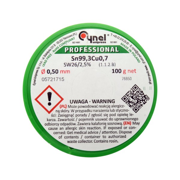 SPOIWO, DRUT LUTOWNICZY BEZOŁOWIOWY Z TOPNIKIEM NA SZPULI 0,5MM, 100G, SN99,3CU0,7 76850 SPOIWO, DRUT LUTOWNICZY BEZOŁOWIOWY Z TOPNIKIEM NA SZPULI 0,5MM, 100G, SN99,3CU0,7 76850 SPOIWO, DRUT LUTOWNICZY BEZOŁOWIOWY Z TOPNIKIEM NA SZPULI 0,5MM, 100G, SN99,3CU0,7 76850