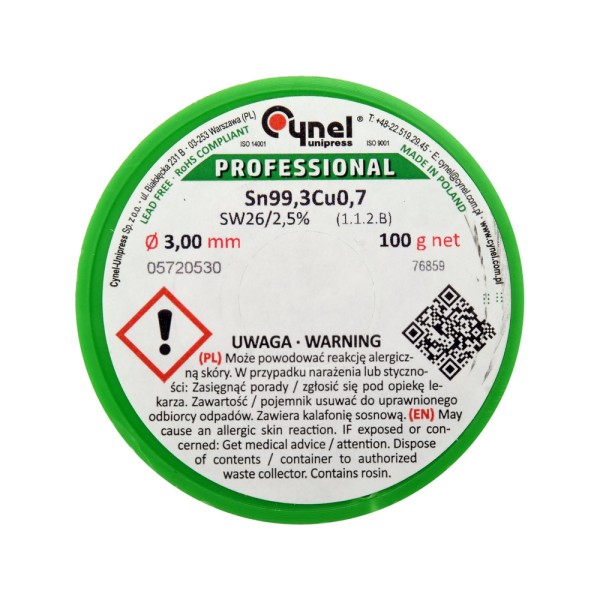 Drut lutowniczy bezołowiowy z topnikiem 3,0 mm, 100 g, Sn99,3Cu0,7
