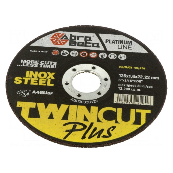 Tarcza tnąca o średnicy 125mm charakteryzuje się grubością 1,6mm. Element wyposażony jest w otwór montażowy o rozmiarze 22,23mm.
