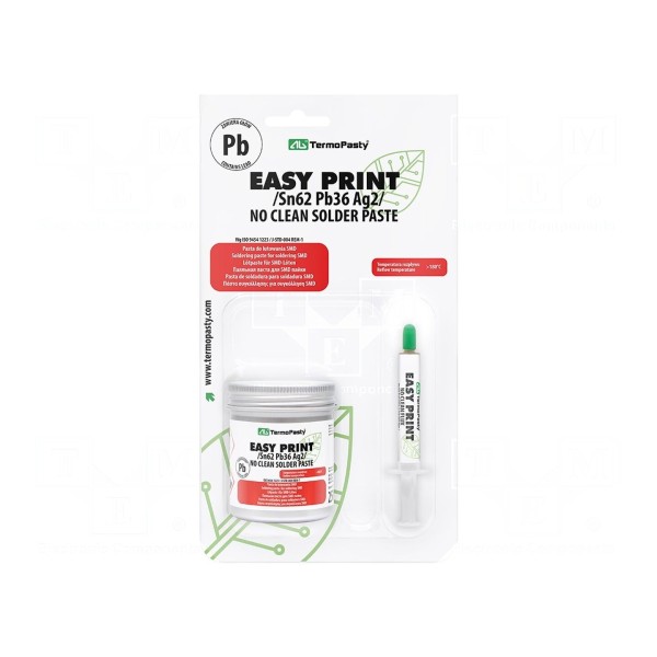Pasta lutownicza ołowiowa o składzie Sn62Pb36Ag2 przeznaczona jest do lutowania miękkiego w przemyśle elektronicznym. Produkt charakteryzuje się temperaturą topnienia wynoszącą 179°C oraz rozmiarem ziaren w zakresie 25–45 µm. Zawartość topnika w paście wynosi 12%.