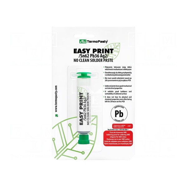 Pasta lutownicza przeznaczona jest do lutowania miękkiego w przemyśle elektronicznym. Produkt bazuje na stopie Sn62Pb36Ag2 o temperaturze topnienia wynoszącej 179°C i jest dostępny w postaci pasty umieszczonej w strzykawce o pojemności 10 ml.