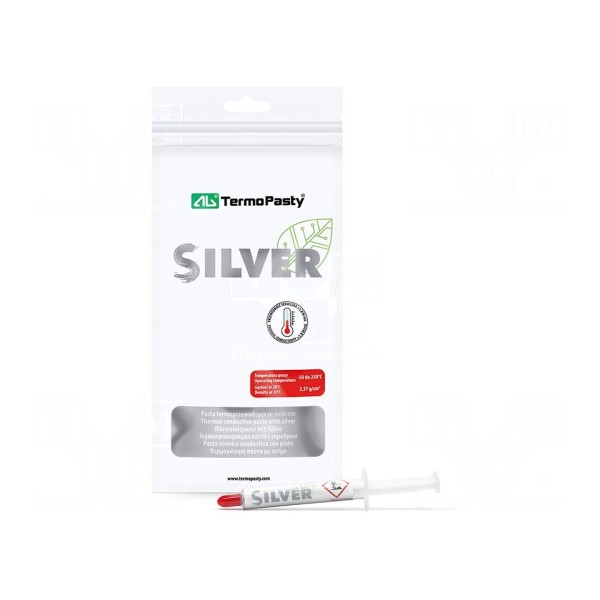 Pasta termoprzewodząca AG SILVER o srebrnym kolorze jest preparatem przeznaczonym do ułatwiania odprowadzania ciepła z podzespołów elektronicznych bezpośrednio na radiatory. Produkt stanowi mieszankę silikonu oraz srebra, co zapewnia przewodność cieplną na poziomie 3,8W/mK.