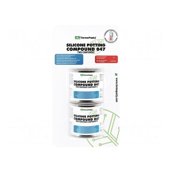 Zalewa silikonowa ART.AGT-317 to dwuskładnikowy preparat chemiczny w postaci płynu, przeznaczony do uszczelniania i hermetyzacji układów elektronicznych. Produkt charakteryzuje się sieciowaniem kondensacyjnym przy zachowaniu proporcji mieszania składników wynoszącej 1:1. Czas wiązania mieszanki wynosi 70 minut, a po utwardzeniu materiał osiąga twardość 20 w skali Shore’a A.