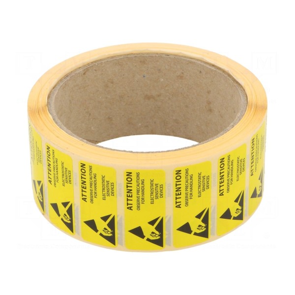 Etykieta samoprzylepna przeznaczona do oznaczania stref i komponentów ESD. Produkt charakteryzuje się wymiarami 16x38mm oraz kolorystyką czarno-żółtą.