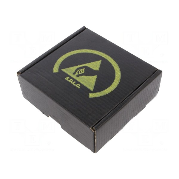 Pudełko ESD przeznaczone jest do przechowywania oraz transportu elementów elektronicznych wrażliwych na wyładowania elektrostatyczne. Pojemnik wykonany został z tektury w kolorze czarnym i wyposażony w wewnętrzną warstwę gąbki, która zabezpiecza zawartość przed uszkodzeniami mechanicznymi.
