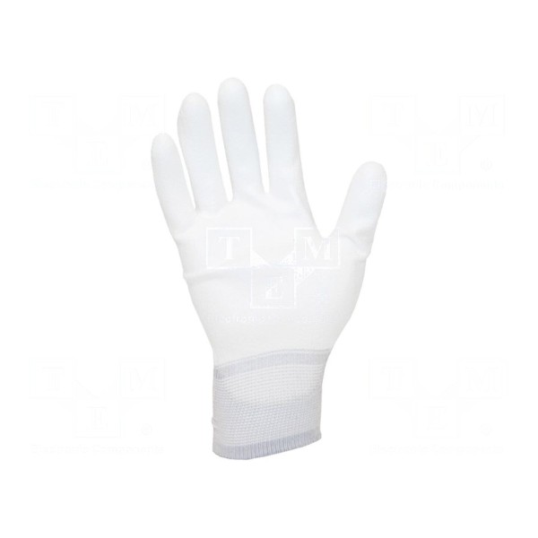 Wewnętrzna strona rękawiczek została pokryta warstwą poliuretanu, co wpływa na chwytność podczas operowania drobnymi elementami. Produkt dostępny jest w kolorze białym w rozmiarze M.
