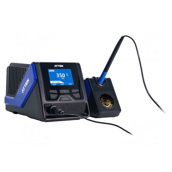 Stacja lutownicza o mocy 150W przystosowana jest do zasilania napięciem 230V AC. Urządzenie pozwala na pracę w zakresie temperatur od 150 do 480°C, przy czym moc samej lutownicy wynosi 130W. Wyposażona jest w wyświetlacz LCD oraz panel sterowania z przyciskami umożliwiającymi cyfrową regulację temperatury.