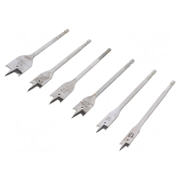 Zestaw zawiera sześć wierteł wykonanych ze stali szybkotnącej HSS, przeznaczonych do obróbki drewna. Narzędzia charakteryzują się średnicami roboczymi wynoszącymi odpowiednio 13 mm, 16 mm, 20 mm, 22 mm, 25 mm oraz 32 mm.