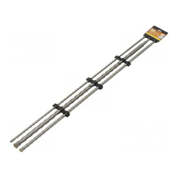 Zestaw zawiera trzy wiertła przeznaczone do obróbki betonu, charakteryzujące się długością roboczą wynoszącą 1 metr. Narzędzia zostały wykonane ze stali i wyposażone w uchwyt typu SDS, co umożliwia współpracę z kompatybilnymi elektronarzędziami.