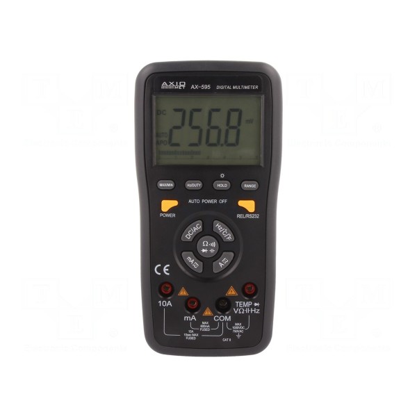 Multimetr cyfrowy AXIOMET AX-595 umożliwia wszechstronny pomiar napięcia DC w zakresie do 1kV, napięcia AC do 750V oraz prądu stałego i zmiennego do 10A. Urządzenie pozwala również na precyzyjny pomiar rezystancji do 60MΩ, częstotliwości do 20MHz, pojemności do 200µF oraz temperatury w przedziale od -20 do 1000°C. Przyrząd został wyposażony w wyświetlacz LCD o rozdzielczości 5999 z dodatkowym bargrafem, a częstotliwość próbkowania wynosi 3 odczyty na sekundę.