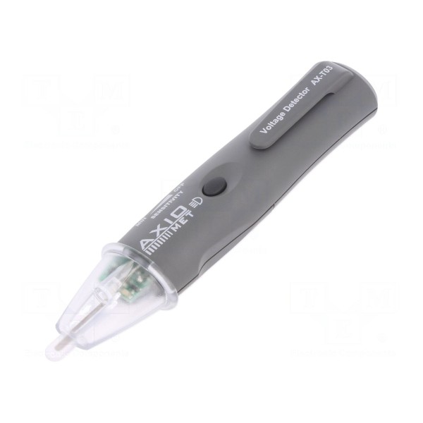 Bezdotykowy wykrywacz napięcia AXIOMET AX-T03 przeznaczony jest do wykrywania napięcia zmiennego w zakresie od 5 do 1000V AC przy częstotliwościach roboczych od 50 do 400Hz. Przyrząd umożliwia lokalizację przerw w przewodach znajdujących się pod napięciem. Sygnalizacja wykrytego napięcia odbywa się w sposób optyczny za pomocą diod LED oraz akustyczny.