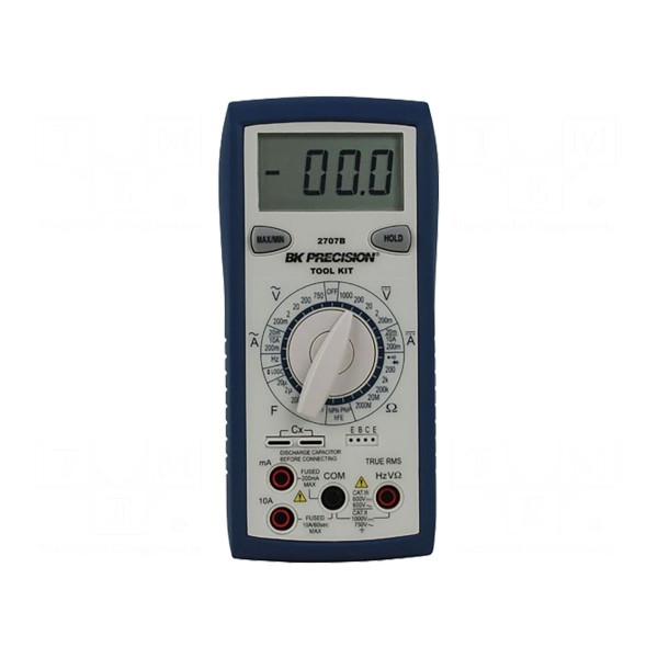 Multimetr cyfrowy B&K PRECISION 2707B to urządzenie umożliwiające pomiar napięcia AC/DC, prądu AC/DC, rezystancji, pojemności oraz częstotliwości. Przyrząd obsługuje funkcję pomiaru rzeczywistej wartości skutecznej True RMS z próbkowaniem na poziomie 2,5x/s. Wyposażony jest w wyświetlacz LCD o rozdzielczości 3,5 cyfry, wskazujący maksymalnie 1999 jednostek.