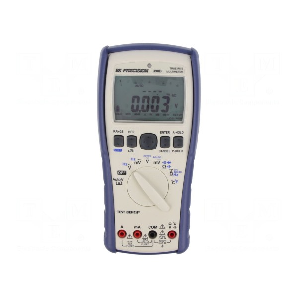 Multimetr cyfrowy BK390B to urządzenie umożliwiające pomiar napięć DC i AC do 1kV, prądu AC/DC do 10A, rezystancji do 40MΩ, pojemności do 40mF, częstotliwości do 100kHz oraz temperatury w zakresie od -200°C do 1200°C. Przyrząd obsługuje pomiar True RMS dla przebiegów AC oraz AC+DC. Wyniki prezentowane są na wyświetlaczu LCD o rozdzielczości 40000 z dodatkowym bargrafem, przy częstotliwości próbkowania wynoszącej 10 razy na sekundę.