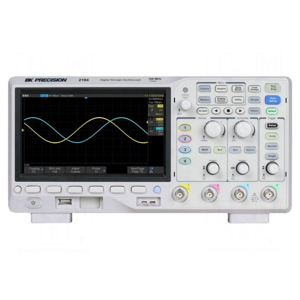Cyfrowy oscyloskop BK2194 oferuje pasmo 100MHz przy czterech kanałach wejściowych oraz szybkość próbkowania 1Gsps. Długość rekordu pamięci wynosi 14Mpts na kanał, a rozdzielczość pionowa przetwornika to 8 bitów. Urządzenie zapewnia czułość wejściową w zakresie od 1mV/dz do 10V/dz, przy impedancji wejściowej 1MΩ/11pF i czasie narastania wynoszącym 3,5ns. Maksymalne napięcie wejściowe urządzenia wynosi 400V, a sprzężenie wejścia realizowane jest w trybach AC, DC oraz GND.