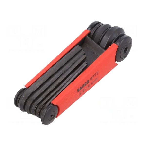 Zestaw zawiera siedem kluczy typu imbus o rozmiarach HEX 2,5mm, 3mm, 4mm, 5mm, 6mm, 8mm oraz 10mm. Narzędzia przeznaczone są do obsługi śrub z gniazdem sześciokątnym.
