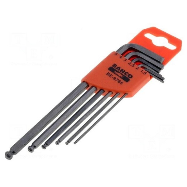 Zestaw zawiera sześć kluczy typu imbus o rozmiarach HEX 1,5 mm, 2 mm, 2,5 mm, 3 mm, 4 mm oraz 5 mm. Narzędzia zostały wykonane ze stali chromowo-wanadowej, co zapewnia trwałość materiału podczas eksploatacji.