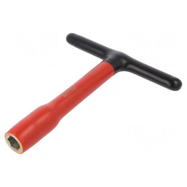 Klucz nasadowy izolowany o rozmiarze gniazda HEX 17mm został zaprojektowany do pracy pod napięciem do 1kV. Narzędzie wyposażone jest w rękojeść typu T, co umożliwia wygodne operowanie w warunkach wymagających użycia siły. Konstrukcja wykonana ze stali stopowej zapewnia wymaganą sztywność podczas dokręcania elementów złącznych.