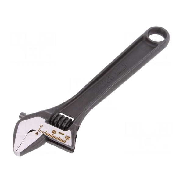 Klucz nastawny BAHCO 8070 charakteryzuje się całkowitą długością 155 mm oraz maksymalnym rozwarciem szczęk wynoszącym 20 mm. Konstrukcja narzędzia przystosowana jest do pracy ze śrubami i nakrętkami o zróżnicowanych rozmiarach w podanym zakresie.