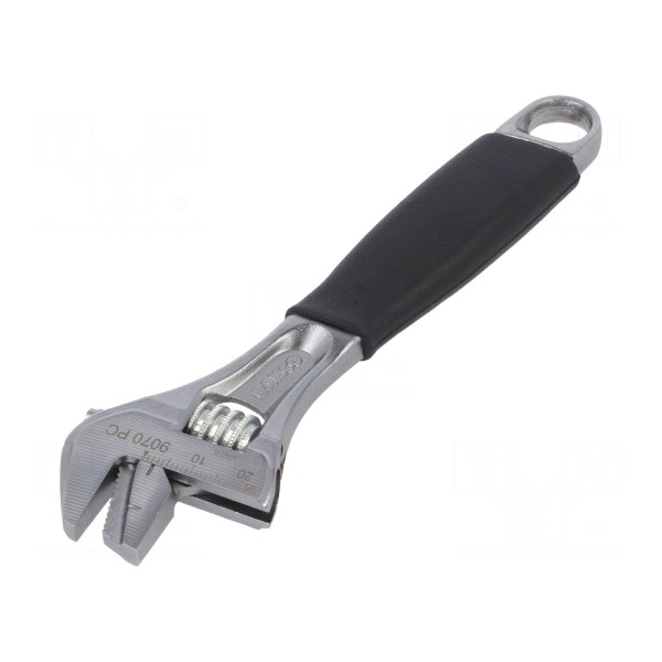 Klucz nastawny BAHCO o całkowitej długości 158 mm umożliwia pracę z elementami złącznymi o maksymalnym rozwarciu szczęk wynoszącym 21 mm. Narzędzie zostało wykonane z dbałością o ochronę powierzchni, która została poddana procesowi chromowania.