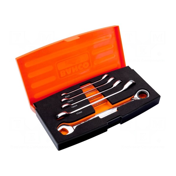 Zestaw zawiera klucze płasko-oczkowe wyposażone w mechanizm grzechotkowy. W skład kompletu wchodzi pięć narzędzi o rozmiarach 8mm, 10mm, 13mm, 17mm oraz 19mm.