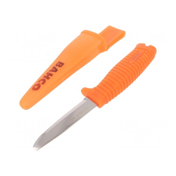 Nóż ratunkowy BAHCO przeznaczony jest do przecinania lin oraz siatek. Narzędzie o długości całkowitej 230 mm wyposażone zostało w ząbkowane ostrze o długości 102 mm, wykonane ze stali nierdzewnej, która wykazuje odporność na korozję.