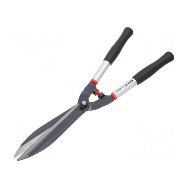 Nożyce ogrodowe przeznaczone do przycinania żywopłotów. Narzędzie posiada ostrze wykonane ze stali oraz aluminiową rękojeść, co wpływa na konstrukcję urządzenia.