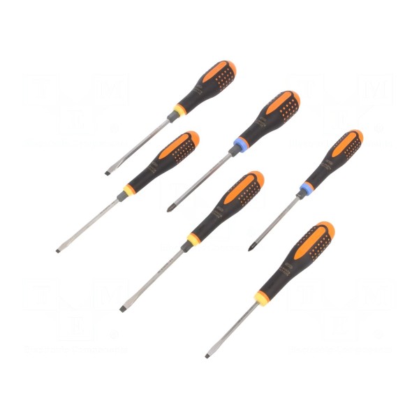 W skład kompletu wchodzą wkrętaki z grotami płaskimi o rozmiarach SL 0,6, SL 0,8, SL 1,0 oraz SL 1,2, a także wkrętaki z końcówkami typu Pozidriv w rozmiarach PZ1 oraz PZ2. Narzędzia wykonano z uwzględnieniem ergonomii, co wpływa na wygodę użytkowania w trakcie pracy.
