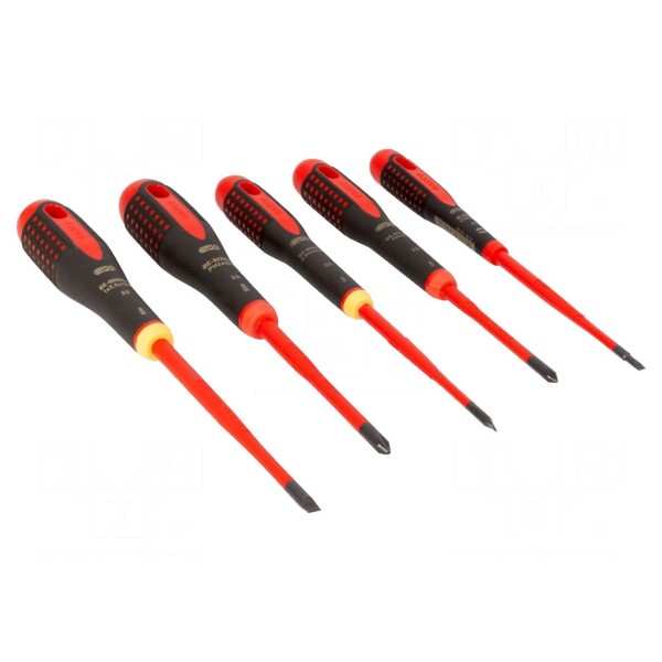 Zestaw izolowanych wkrętaków BAHCO składa się z pięciu narzędzi przeznaczonych do prac pod napięciem. W komplecie znajdują się groty typu Phillips w rozmiarach PH1 i PH2 oraz groty płaskie o wymiarach 3x0,5 mm, 4x0,8 mm i 5,5x1 mm.