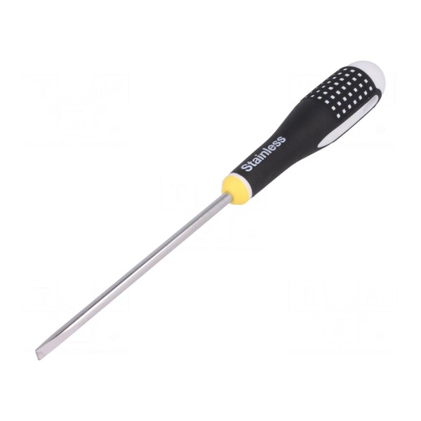 Wkrętak standardowy z grotem płaskim o wymiarach 5,5x1mm przeznaczony jest do prac montażowych. Ostrze o długości 125mm zostało wykonane ze stali nierdzewnej, co zapewnia odpowiednią odporność na korozję. Całkowita długość narzędzia wynosi 247mm.