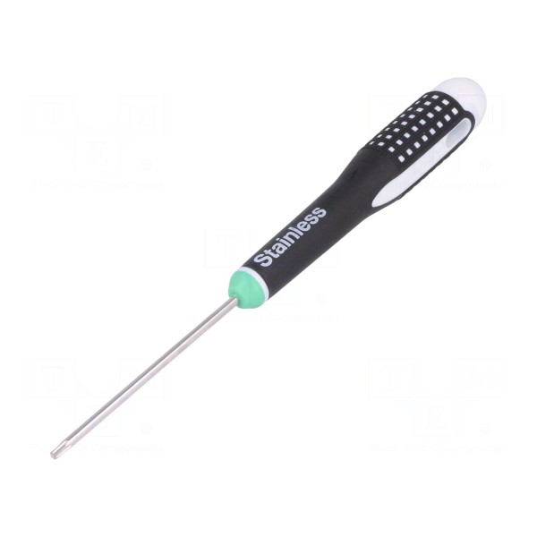 Wkrętak standardowy wyposażony w grot typu Torx w rozmiarze TX10. Ostrze o długości 75 mm wykonano ze stali nierdzewnej, co wpływa na trwałość narzędzia podczas prac montażowych. Całkowita długość wkrętaka wynosi 197 mm.