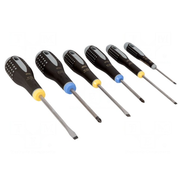 Zestaw wkrętaków zawiera 6 elementów o zróżnicowanych typach oraz rozmiarach końcówek. W komplecie znajdują się groty typu płaskiego o wymiarach 3,5x0,5 mm, 4x0,8 mm, 5,5x1 mm oraz 6,5x1,2 mm, a także groty typu Pozidriv w rozmiarach PZ1 i PZ2. Wszystkie wkrętaki posiadają czernione końcówki ostrzy.