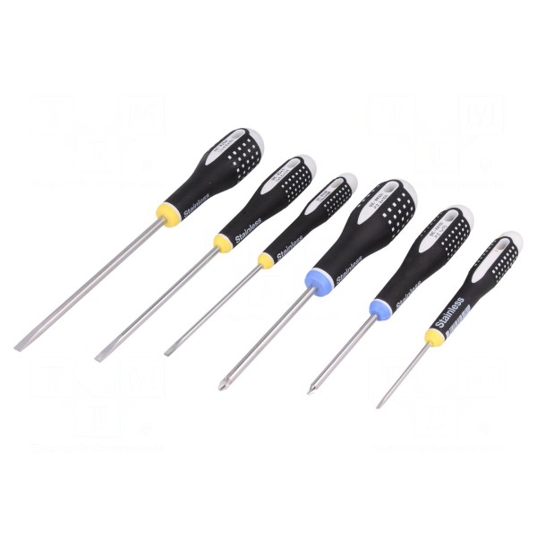 Zestaw zawiera sześć uniwersalnych wkrętaków wykonanych ze stali nierdzewnej. W skład kompletu wchodzą narzędzia z grotami typu płaskiego oraz Pozidriv, obejmujące rozmiary PZ1, PZ2 oraz warianty o wymiarach ostrza 1mm (5,5mm/125mm), 1,2mm (6,5mm/150mm), 0,5x3mm (60mm), 0,8x4mm (100mm) i PH1 (7mm).