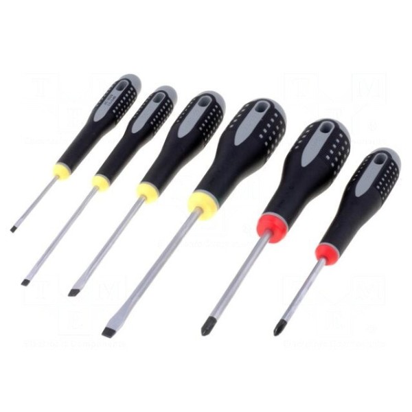 Konstrukcja każdego z wkrętaków opiera się na trójkomponentowej, ergonomicznej rękojeści. Zastosowany system kolorystyczny uchwytów pozwala na szybką identyfikację rodzaju końcówki. W skład zestawu wchodzą modele o wymiarach ostrza 0,5x3mm (długość ostrza 60mm, długość całkowita 180mm), 0,8x4mm (100mm/220mm), 1x5,5mm (100mm/220mm), PH1 (75mm/195mm), 1,2x6,5mm (125mm/245mm) oraz PH2 (100mm/225mm).