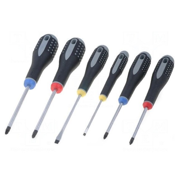 Zestaw składa się z sześciu wkrętaków uniwersalnych przeznaczonych do różnych typów połączeń śrubowych. Narzędzia wyposażono w groty typu Phillips, Pozidriv oraz płaskie, co pozwala na obsługę szerokiego zakresu elementów złącznych.