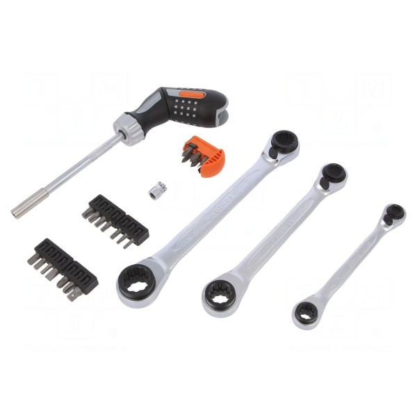 W zestawie: adapter 1/4", klucze oczkowe, końcówki wkrętakowe, rękojeść wkrętakowa z grzechotką.