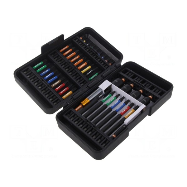 Całość została umieszczona w praktycznym futerale ułatwiającym przechowywanie i transport elementów. Uchwyt narzędziowy przystosowany jest do standardu C6,3 mm. W zestawie: końcówki wkrętakowe, uchwyt magnetyczny 1/4" o długości 75 mm z mocowaniem 1/4"-E6,3.