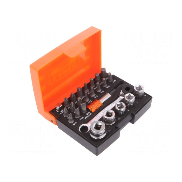 W zestawie: adapter, grzechotka 1/4", końcówki wkrętakowe, nasadki 6-kątne.