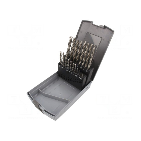 W komplecie znajdują się wiertła o średnicach od 1 mm do 10 mm, rosnące co 0,5 mm. Dzięki zastosowanym materiałom wiertła sprawdzają się w obróbce stali nierdzewnej, stali stopowej, żeliwa, mosiądzu oraz brązu.