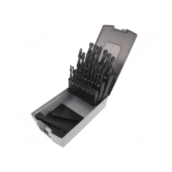 Zestaw zawiera 25 wierteł wykonanych ze stali szybkotnącej walcowanej typu HSS-R, przeznaczonych do obróbki metalu. Konstrukcja narzędzi jest zgodna z normą DIN 338.