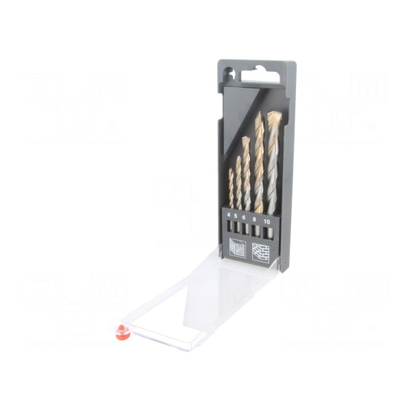 Zestaw zawiera pięć wierteł wykonanych ze stali, przeznaczonych do pracy w betonie oraz materiałach ceglanych. W skład kompletu wchodzą narzędzia o średnicach 4mm, 5mm, 6mm, 8mm oraz 10mm.