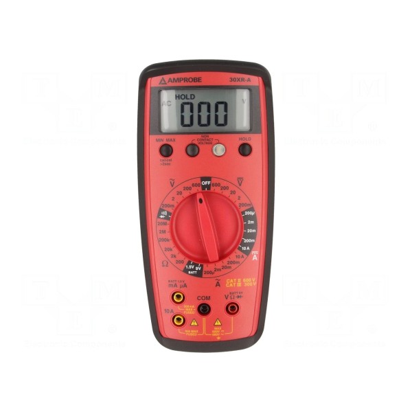 Multimetr cyfrowy 30XR przeznaczony jest do pomiarów napięcia AC/DC, prądu AC/DC oraz rezystancji. Urządzenie oferuje 9 funkcji pomiarowych i 30 zakresów, co pozwala na wszechstronne zastosowanie w diagnostyce elektrycznej. Wyniki prezentowane są na wyświetlaczu LCD o rozdzielczości 3,5 cyfry, czyli 1999 jednostek. Przyrząd obsługuje ręczną zmianę zakresów oraz dodatkowo umożliwia testowanie baterii, diod przy prądzie 1mA przy 3V oraz ciągłości obwodu z sygnalizacją akustyczną dla rezystancji poniżej 75Ω.