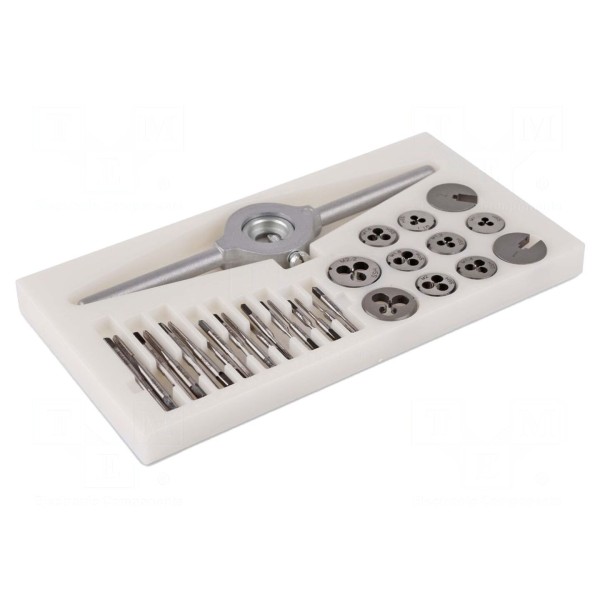 W zestawie: gwintowniki, narzynki, uchwyt do gwintowników, uchwyt do narzynek.