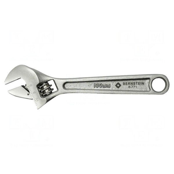 Klucz nastawny BERNSTEIN 6-771 to narzędzie ręczne o całkowitej długości 100 mm. Konstrukcja umożliwia regulację rozwarcia szczęk do maksymalnie 13 mm, co pozwala na dopasowanie narzędzia do różnych elementów złącznych w tym zakresie wymiarowym.