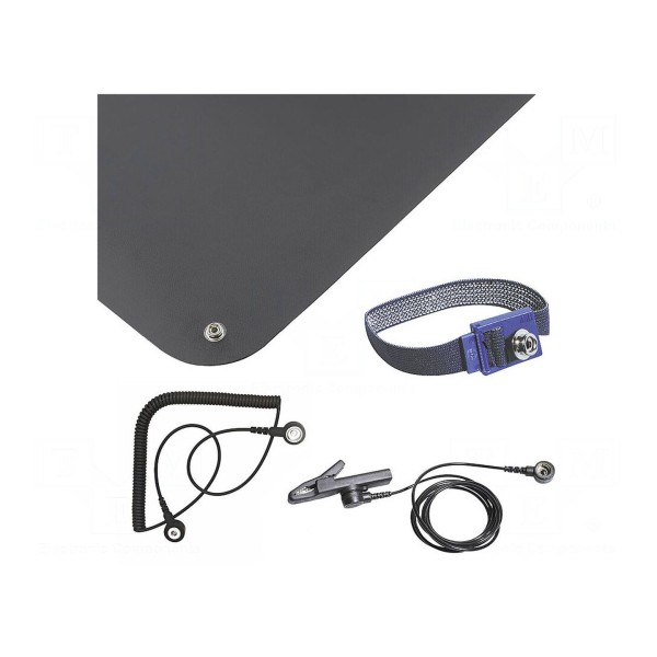 W zestawie: mata antystatyczna, opaska na rękę z zatrzaskiem męskim 4mm, przewód spiralny zakończony zatrzaskami żeńskimi 4mm i 10mm, przewód uziemiający oraz zacisk krokodylkowy. Komplet zawiera niezbędne elementy do konfiguracji stanowiska pracy chronionego przed skutkami ESD.