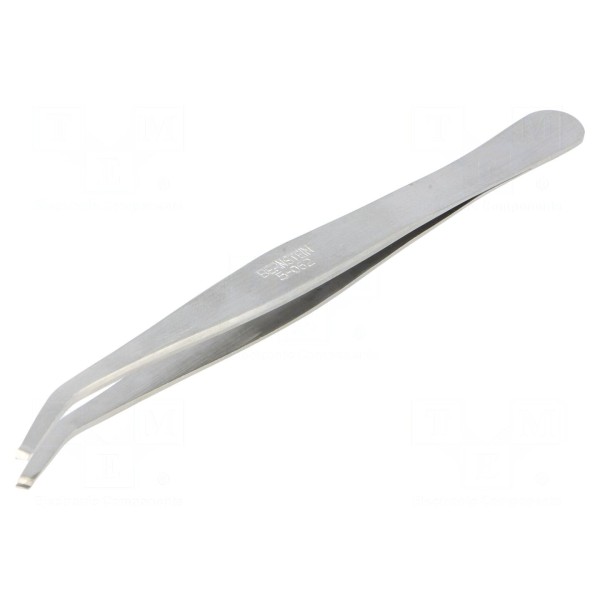 Pęseta zagięta BERNSTEIN przeznaczona jest do prac z elementami SMD. Narzędzie wykonane jest ze stali nierdzewnej, co zapewnia wysoką odporność na działanie większości kwasów w środowisku pracy. Powierzchnia narzędzia posiada matowe wykończenie o właściwościach niemagnetycznych.