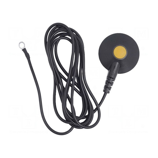 Długość przewodu wynosi 1,5m, co pozwala na wygodną konfigurację stanowiska. Wyposażenie końcowe obejmuje konektor oczkowy M5 oraz zatrzask żeński 10mm, co umożliwia pewny montaż w systemach ochrony antystatycznej.