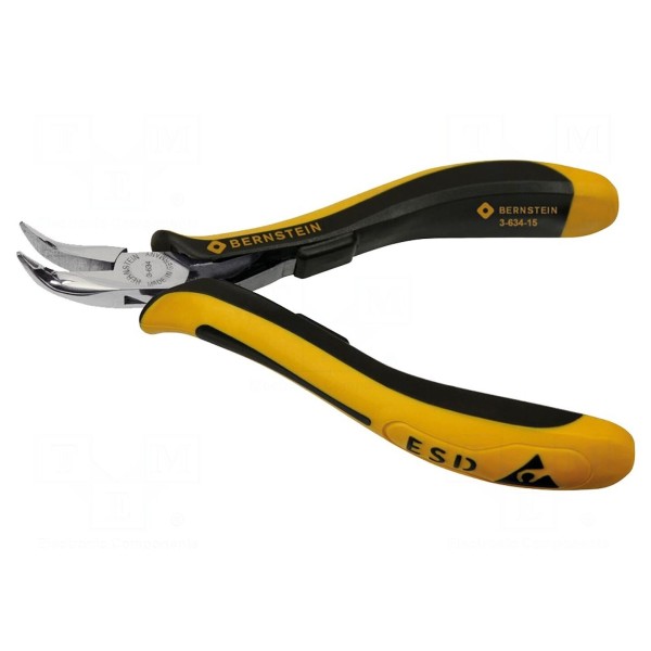 Narzędzie typu szczypce o konstrukcji odgiętej i półokrągłym kształcie szczęk. Produkt charakteryzuje się całkowitą długością wynoszącą 120 mm.