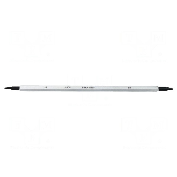 Trzon wymienny dwustronny o długości całkowitej 120mm wyposażony jest w dwa płaskie groty o rozmiarach 1,5x0,4mm oraz 3x0,6mm. Narzędzie jest przeznaczone do prac wymagających szybkiej zmiany końcówki roboczej.