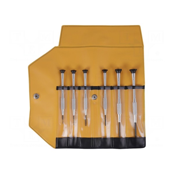 W skład zestawu wchodzi sześć sztuk wkrętaków precyzyjnych o zróżnicowanych parametrach użytkowych. Komplet stanowi funkcjonalne wyposażenie stanowiska serwisowego lub warsztatu zajmującego się naprawami sprzętu elektronicznego i mechaniki precyzyjnej.