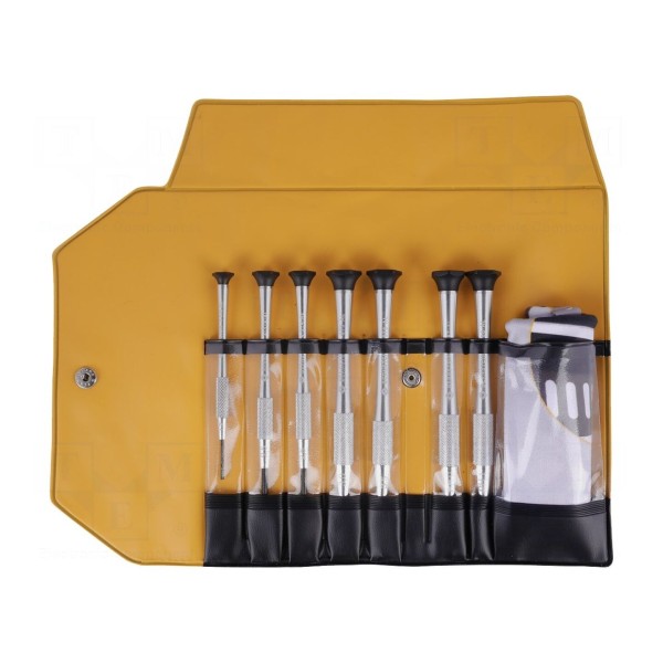 W skład zestawu wchodzi siedem sztuk narzędzi wkrętakowych. Komplet umożliwia prowadzenie prac serwisowych oraz montażowych w urządzeniach precyzyjnych.